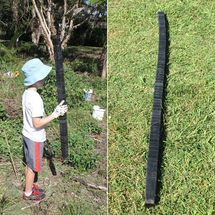 Every volunteer gets a cool job, such as creating a massive ‘pot snake’ (Urna anguis) with the plastic tubestock containers (so they can be taken off-site at the end of the working bee). Pics: Trina McLellan