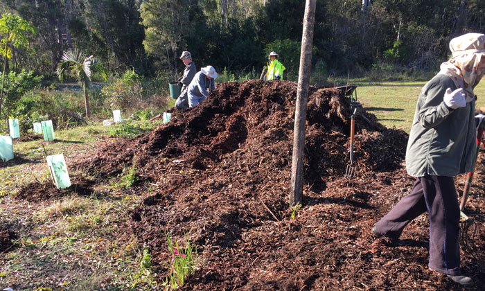 Dawn Road Reserve Bushcare volunteers spread mulch from a pile created by the removal of unwanted pest trees earlier in the year. Pic: Trina McLellan
