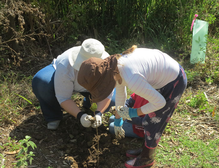 It was evident that the work done in February’s working bee was faring well on the western bank of the stream, so this time the volunteers planted suitable replacement plants on the eastern side of the waterway.