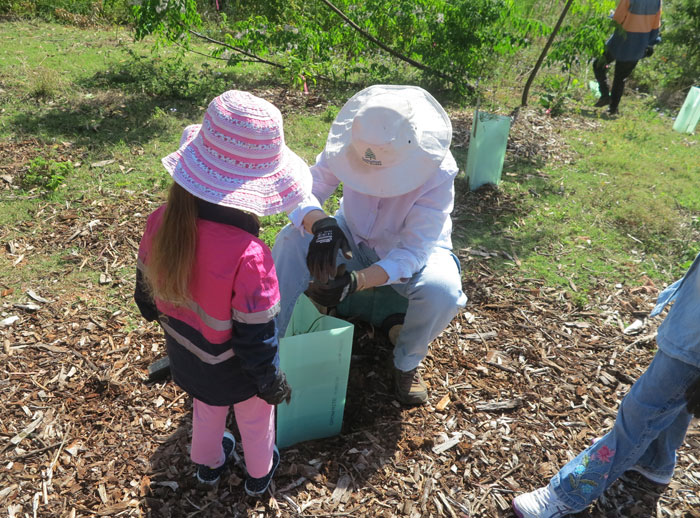 Thanks to demonstrations by Dawn Road Reserve Bushcare’s Janet Mangan, each student was involved in taking great care in preparing the ground for planting, sprinkling fertiliser, repacking soil around their young plant, tamping it down and ensuring stakes were positioned to take protective netting.