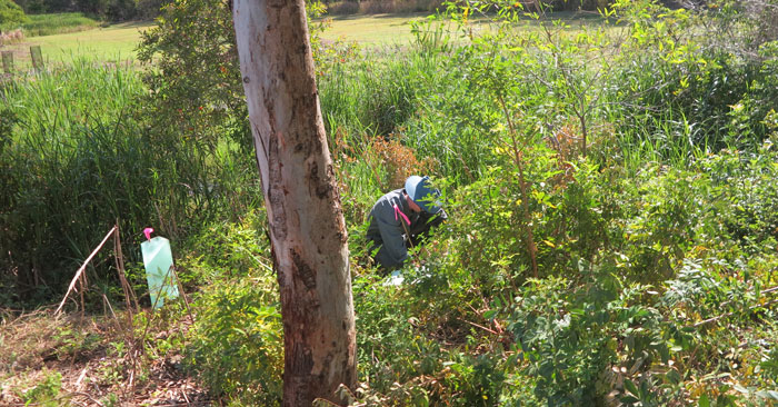 Some remnant regrowth from the persistent broad-leaved pepper trees still needs to be removed from the revelation site because these trees have invasive roots and runners that require drilling and spot-poisoning by one of the trained volunteers. Pic: Trina McLellan