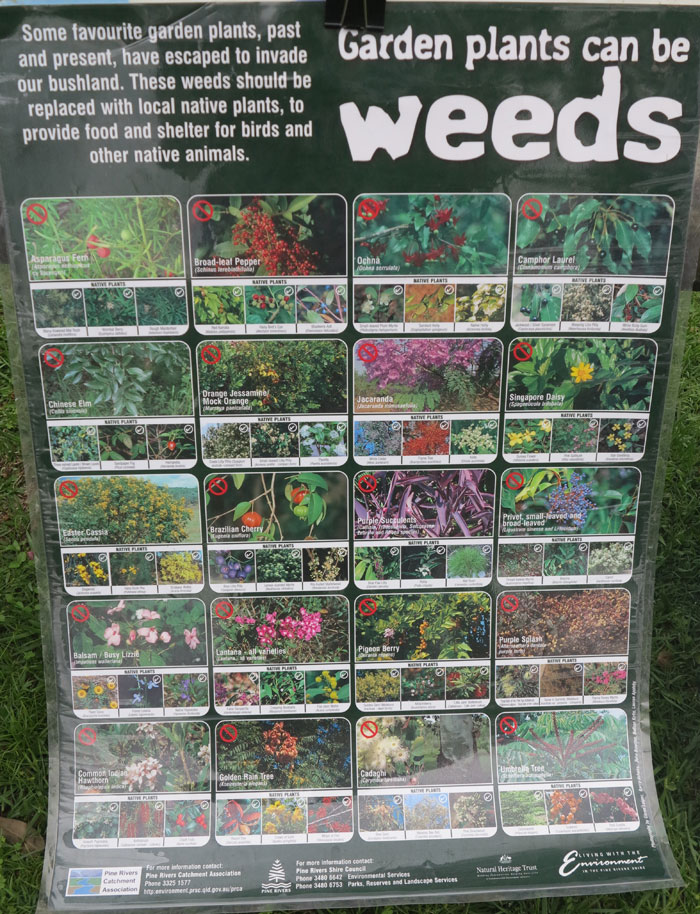 Brisbane City Council’s handy weed identification poster comes in handy when introducing new volunteers at the Dawn Road Reserve Bushcare group. The eastern and southern edges of our reserve abut the BCC’s boundary line, so their weeds are our weeds! Picture: Trina McLellan