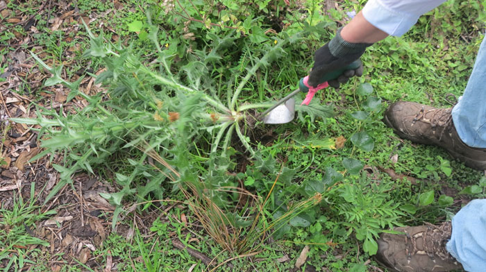 Weeds such as Scotch thistle (Onopordum acanthus) need constant removal from the revegetation site until native species regenerate. Picture: Trina McLellan