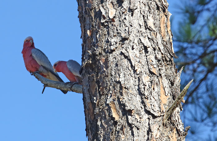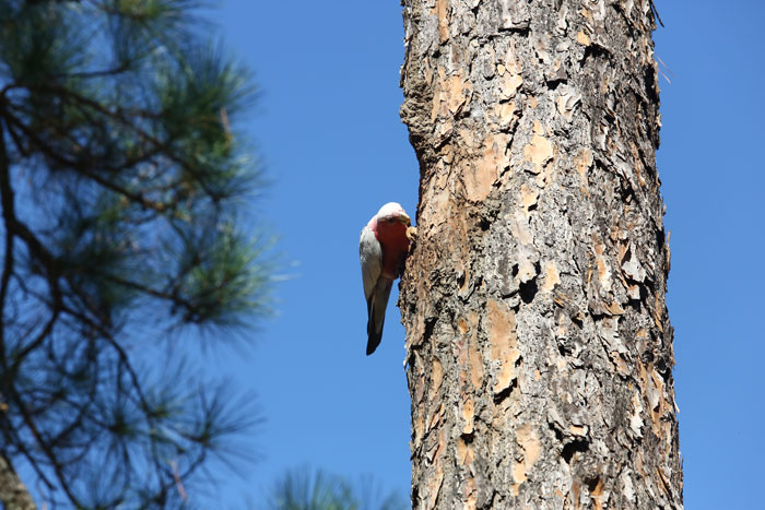 One of the galahs seemed to be hollowing out bark on the side of this pine tree, perhaps preparing the basis of a new nest. Pic: Trina McLellan